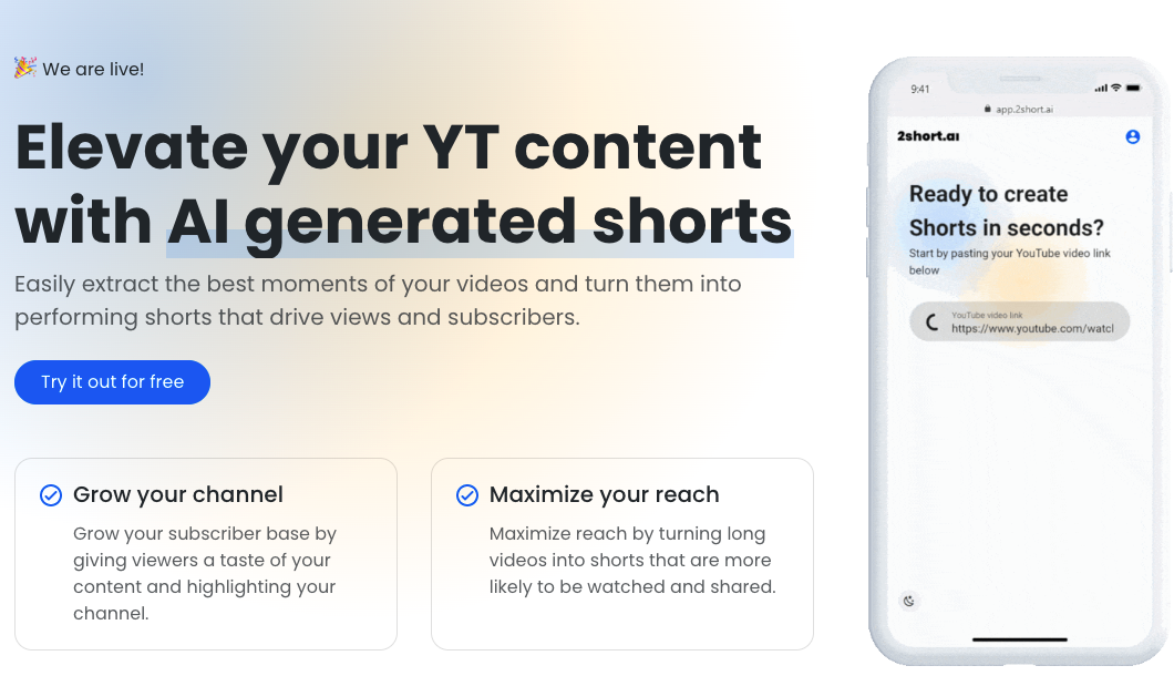 2Short.ai is an AI-powered tool that helps YouTube creators maximize reach and grow their subscriber base by extracting short clips from long videos and turning them into engaging shorts. It also helps save time by automating the process of extracting the best moments from videos.