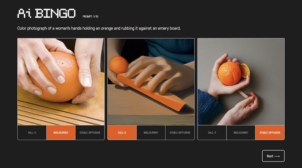 AI Bingo is a guessing game that pits three artists against each other to see who can guess correctly the most. Players must identify which of the three artists - Midjourney, Dalle and Stable Diffusion - is associated with a given prompt. The game is designed to be more entertaining than simply watching three artists share a canvas.