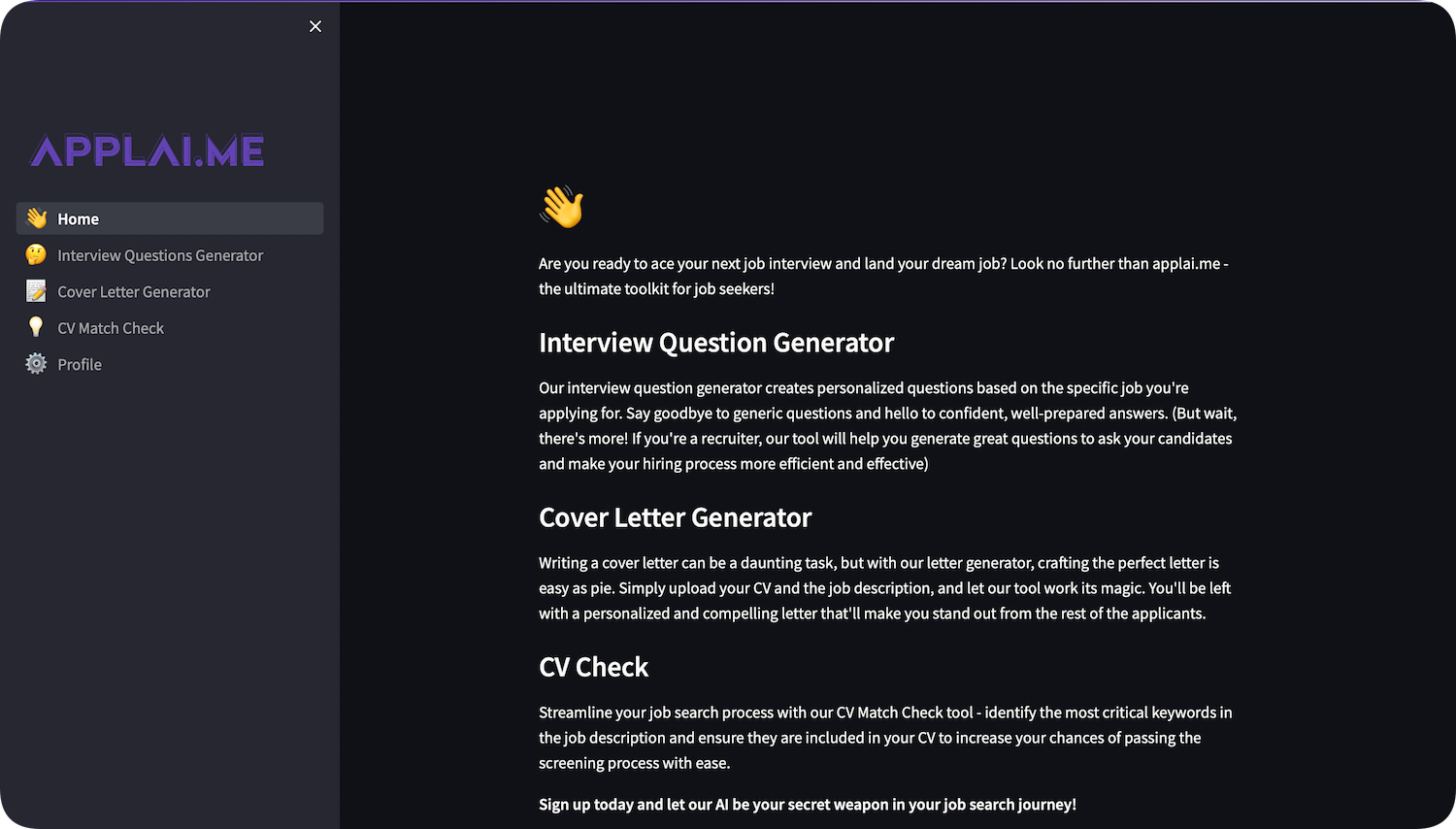 Applai.me's AI-powered job preparation tool helps job seekers to stand out from the competition and ace their interview. It provides a personalized interview question generator, a cover letter generator, and a CV Check tool to match the job description with the candidate's CV. Additionally, the tool can help boost confidence by generating tailored interview questions and ensure that the CV matches the job description to increase the chances of being shortlisted.