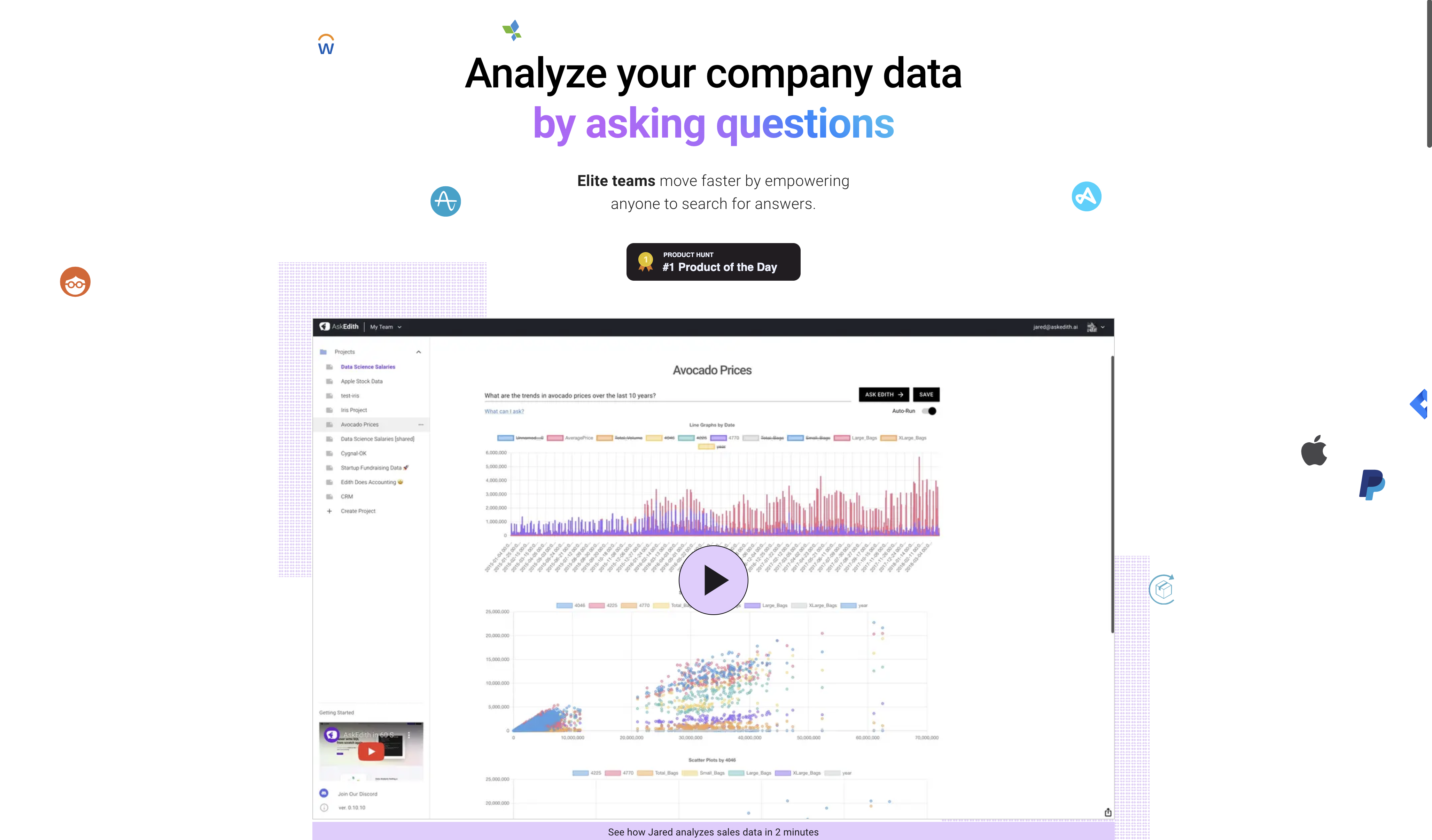 AskEdith is an AI-powered data assistant that helps business leaders and decision makers make sense of their data by connecting and searching all their cloud data. It integrates with over a hundred different data sources and allows users to ask questions directly to unlock the potential of their data. It is universally compatible with databases, CRMs, ERPs, and other applications. AskEdith also attends events such as AI & Big Data Expo, ODSC West, and PrestoCon to help businesses learn more about their data.