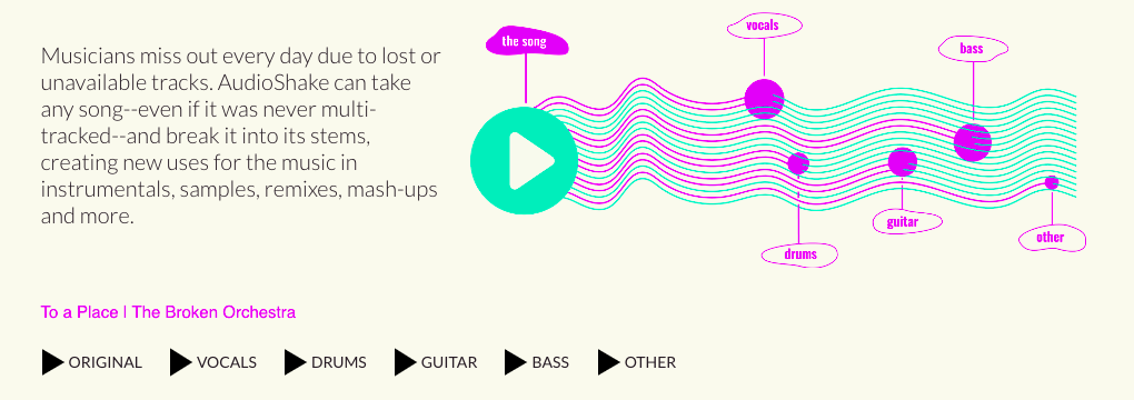 AudioShake is an AI-powered tool for creating musical stems, instrumentals, and remixes from any song. It can take any song—even if it was never multi-tracked—and break it into its stems, allowing for new uses for the music. AudioShake's A.I. technology can recognize different components in a piece of audio, such as drums, and isolate that track for sampling, sync licensing, re-mixes, and more. It can also be used for re-mastering, or to remove bleed from a multi-tracked live recording.