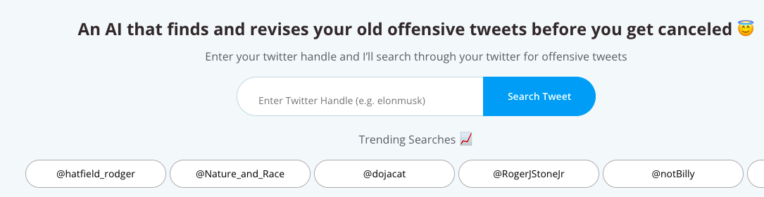 CanceledGPT tool is an AI that searches through a Twitter user's feed for offensive tweets. It allows users to enter a Twitter handle and select a date range. If no toxic tweets are found, the AI will congratulate the user. It also allows users to expose and revise tweets.
