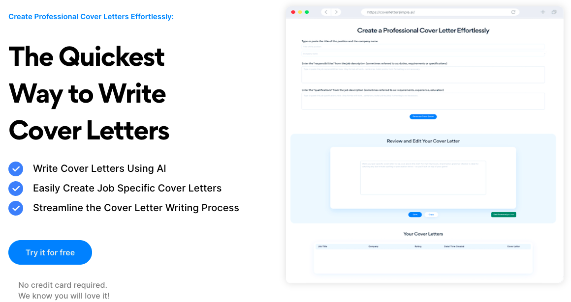 CoverLetterSimple.ai is an AI-powered tool that helps users easily create job-specific cover letters. It allows users to enter a job title and description, and then uses AI technology to analyze the job description and draft a unique cover letter for them. The result is a high-quality cover letter tailored for the job opportunity. It helps users stand out from the competition and get more job interviews.