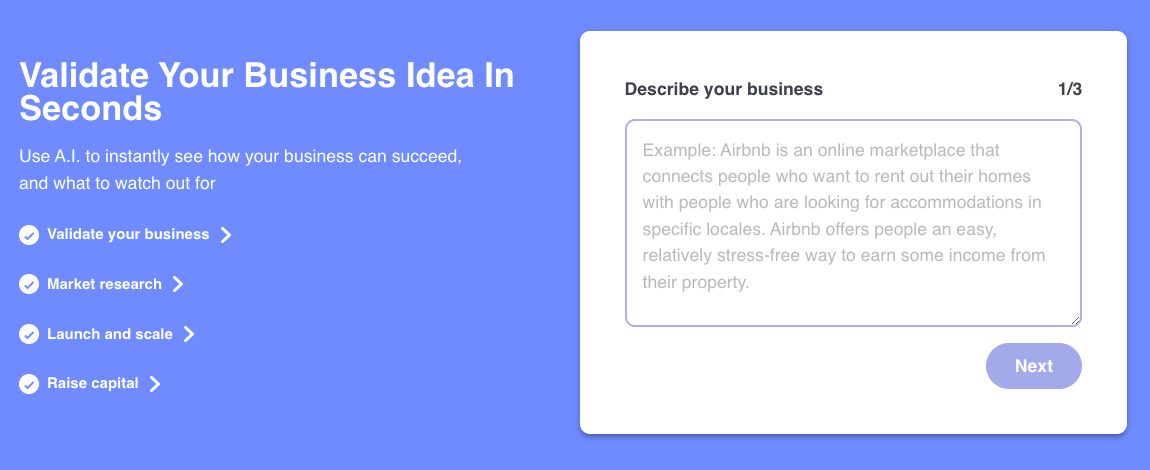 Dimeadozen is an AI-powered tool that helps to validate business ideas in seconds. It provides market research, launch and scale, and raise capital insights for businesses. It also offers competitive analysis, business overviews, elevator pitches, and potential risks for businesses. Additionally, it provides users with SEO copy, website copy, and investor pitches.
