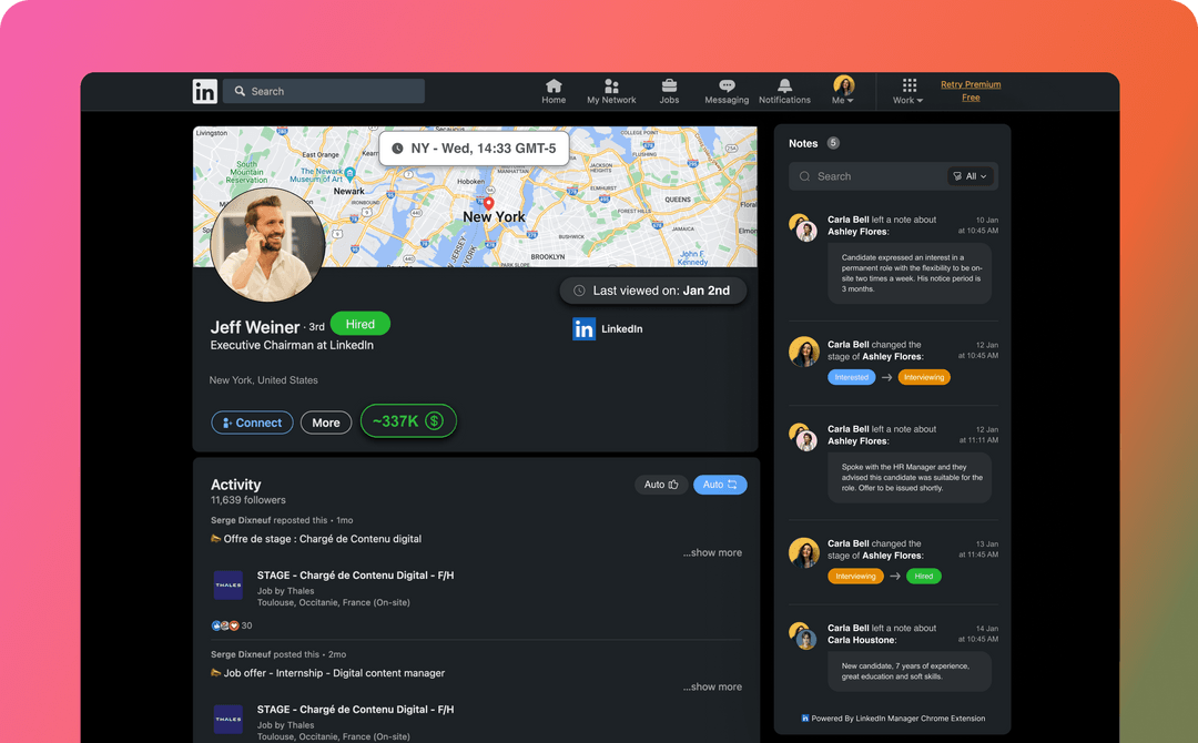 The LinkedIn Manager Assistant is a powerful A.I. tool that helps recruiters save time and make the most of their job search. It features features such as salary estimation, chatGPT integration, notes taking on LinkedIn profiles, last viewed, integrated Google Maps, Auto Like and Auto Repost, and more. With these features, recruiters can easily manage their LinkedIn profiles and quickly find suitable candidates.
