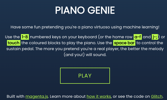 Piano Genie is a tool that allows users to use their computer or phone to simulate playing a piano with the use of machine learning. Users can use either the 1-8 numbered keys on a keyboard, or the home row a-f and j-; to play the piano. The tool also has a sustain pedal feature that is activated with the space bar. Piano Genie works best when used in landscape mode on a phone.