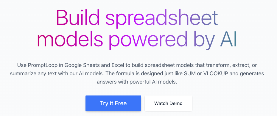 PromptLoop is a spreadsheet formula that enables users to transform, extract, or summarize any text using AI models. It is designed to be used in Google Sheets and Excel, and can generate answers with powerful AI models. It can be used to analyze sales lists, generate keywords and SEO content, unpack survey responses, draft emails and outreach, and transform messy text.