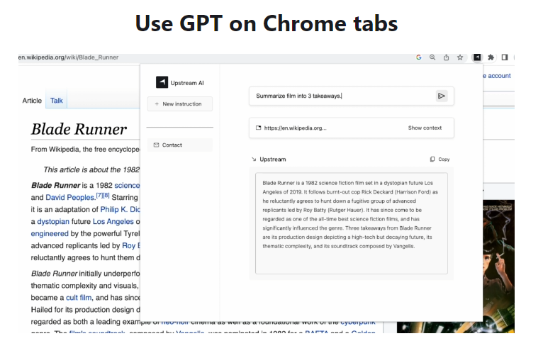 Upstream is a Chrome Extension that lets users easily run GPT on any website. It does the usual things like writing about a topic, summarizing and simplifying content, the difference is that it gathers context automatically from your Chrome tabs.