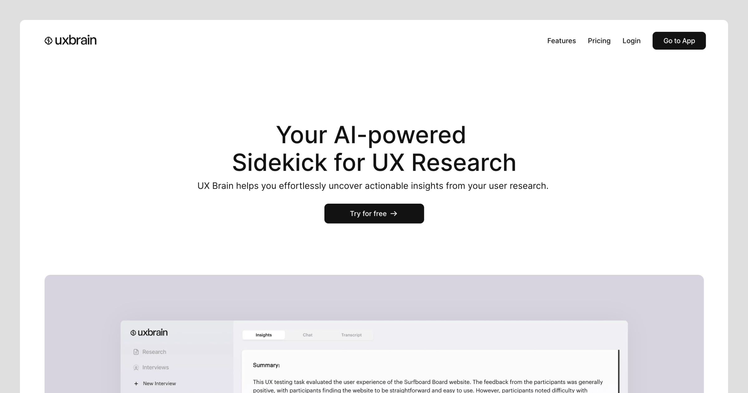 UX Brain is an AI-powered tool designed to help UX researchers effortlessly uncover actionable insights from their user research. It offers features such as accurate AI transcription, summary and insights generation, multi-language support, project-level analysis, contextual collaboration, and flexible pricing.