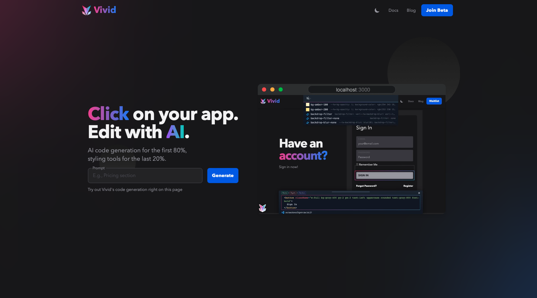 Vivid is an in-browser AI-powered tool that helps developers quickly and easily edit and style web applications. It uses code generation and styling tools to generate components, edit source code, and produce production-ready code in seconds, as well as smarter inspect elements that allow users to understand and modify components in one click.