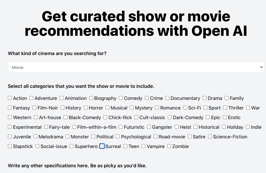 WatchThis.Dev tool provides users with curated show or movie recommendations powered by OpenAI and Vercel Edge Functions. Users can select the type of cinema (TV Show, Movie, or No Preference), as well as select from a list of categories (Action, Adventure, Animation, etc.) and include other specifications. After selecting their preferences, the tool will generate a list of curated recommendations.