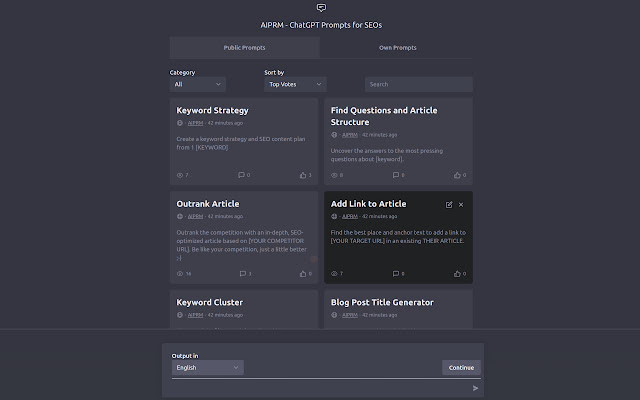 The AIPRM for ChatGPT browser extension provides users with an easy and efficient way to optimize their website and boost its ranking on search engines. It offers a selection of curated prompt templates for SEO, SaaS, Marketing, Art, Programming and more, which are easily accessible with just one click. Users can also save and share their own prompt templates with the community, with the option to add their name and link for recognition and click purposes.