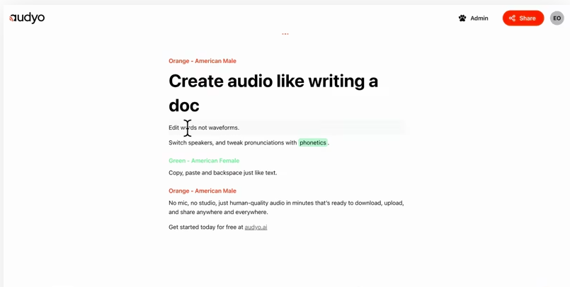 Audyo is a text-to-speech AI voice converter, allowing users to create and edit human-quality AI voices by typing. Users can sign in with Google to get started.