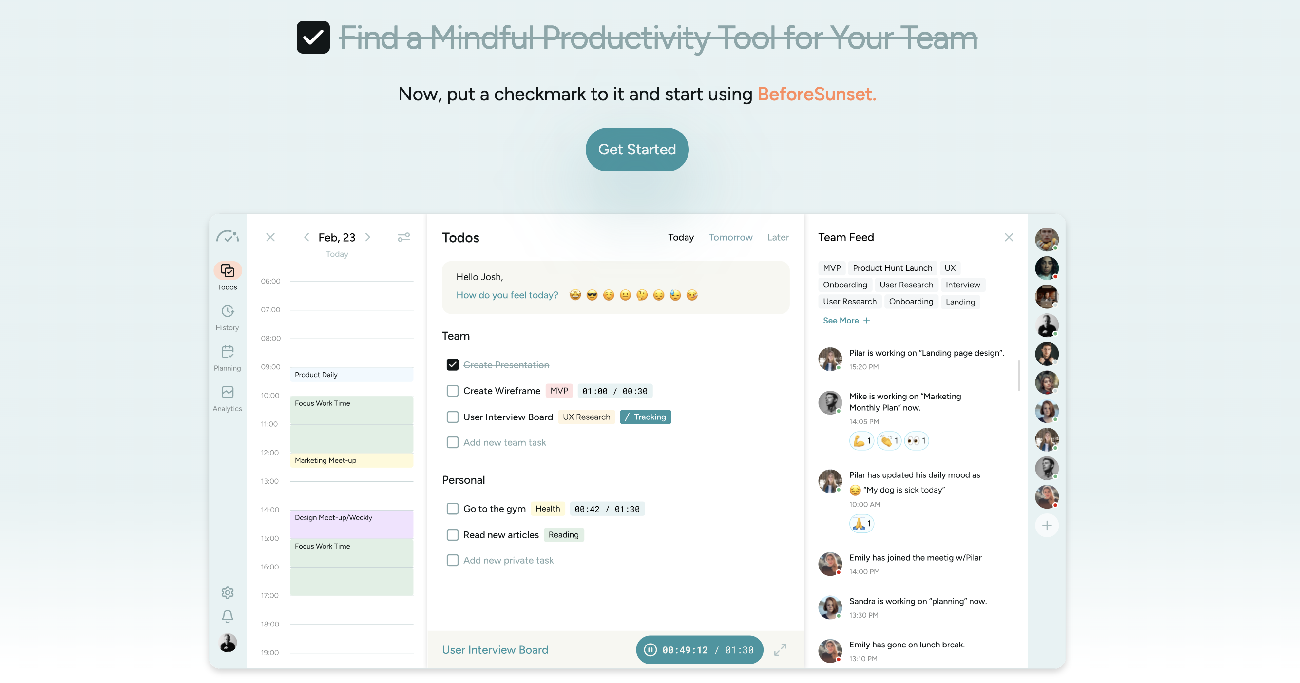BeforeSunset is an AI-powered planner that helps users organize their day and achieve clarity. It offers features such as task actionability, subtask creation, team meeting time suggestions, analytics, time tracking, note taking, tags, and a Sunrise & Sunset Routine. With BeforeSunset, users can plan their day more effectively and productively and can even sync and bond with their team.