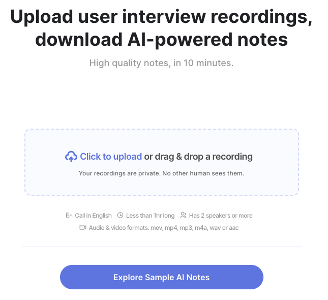 BrewNote is an AI-powered tool that streamlines the process of extracting notes from user interviews. It allows users to upload their interview recordings and download high-quality notes generated by artificial intelligence within just 10 minutes. The tool ensures privacy as no other humans have access to the recordings. It specifically caters to calls conducted in English, lasting less than 1 hour, and involving two or more speakers. Supported audio and video formats include mov, mp4, mp3, m4a, wav, and aac. Users can also explore sample AI-generated notes to get a better understanding of the tool's capabilities.