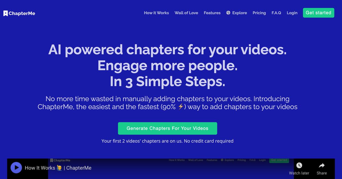 ChapterMe is an AI-powered tool that helps users to easily and quickly add chapters to their videos. It supports YouTube videos and more video integrations will be coming soon. It can generate chapters 90% faster than manual methods and allows users to customize the player to match their brand. It also offers chapter and engagement analytics to help users learn what works and what doesn't and provides video A/B testing to help users find the best video for their website.
