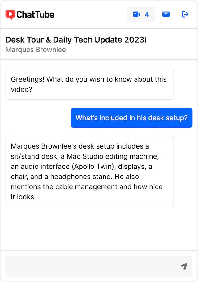 ChatTube is a Chrome extension that allows users to interact with any YouTube video using AI-generated conversations. It enhances the learning and entertainment experience by providing personalized conversations for various passions, such as tech and gadgets, fitness and health, travel and adventure, education and students, content creators, art and craft admirers, and more. The AI chatbot keeps a history of conversations for previously watched videos, with a limit of 5 videos per day during the free trial.