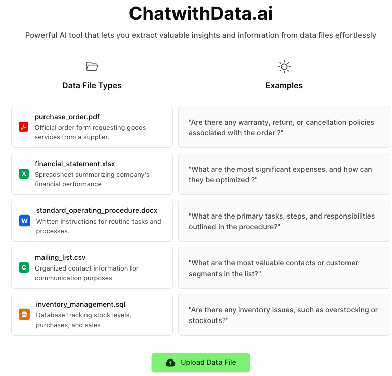 Chat With Data is an AI tool that allows users to upload various types of documents such as PDF, Word, CSV, Excel, and SQL Database and interact with them using natural language via an interactive chat interface powered by OpenAI. This means that users can ask questions about the content of their documents and ChatwithData will provide relevant responses and prompts to facilitate further conversation.