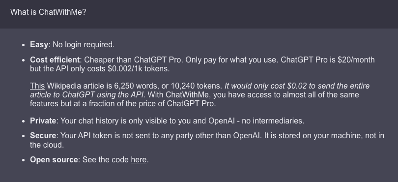 ChatWithMe is a chatbot tool that allows users to communicate directly with OpenAI without the need for a login. It is cost-effective and private, as the API token is stored locally on the user's machine and the chat history is only visible to the user and OpenAI. It also has customizable chat personalities, a browser extension for quick access, and content summarization.