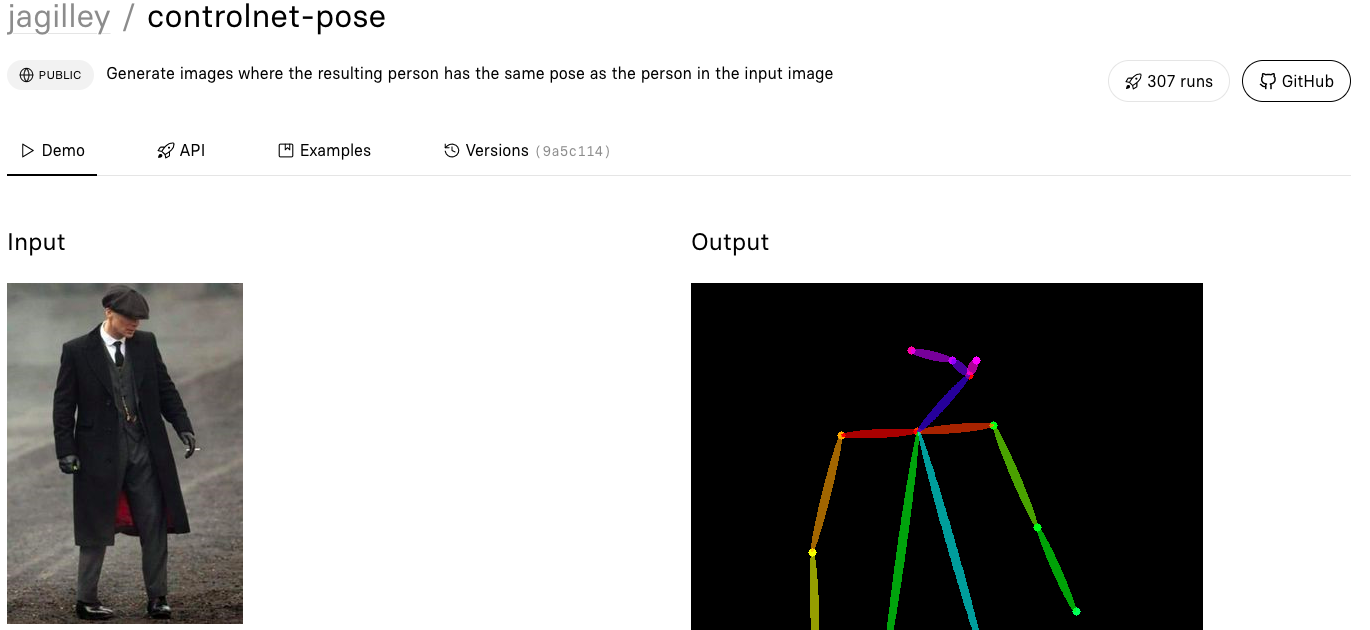ControlNet Pose tool is used to generate images that have the same pose as the person in the input image. It uses Stable Diffusion and Controlnet to copy weights of neural network blocks into a "locked" and "trainable" copy. The user can define the number of samples, image resolution, guidance scale, seed, eta, added prompt, negative prompt, and resolution for detection. The predictions usually complete within 21 seconds.