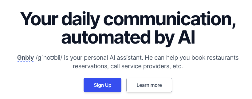 Gnbly is an AI executive assistant designed to make communication easier. It can book restaurant reservations, call service providers, schedule appointments, provide customer service support, and gather business inquiries. It also offers features such as call recording, navigating through IVR, call forwarding, lead qualification reports, and email/phone support. There are three different pricing plans available, ranging from a hobby plan to an enterprise plan.