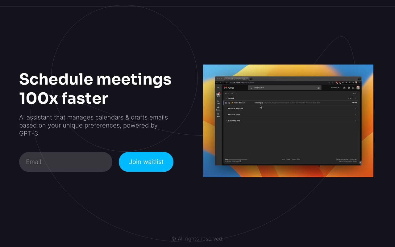 This AI assistant tool helps to schedule meetings 100x faster by managing calendars and drafting emails based on users' preferences, powered by GPT-3. It is currently in its waitlist stage.