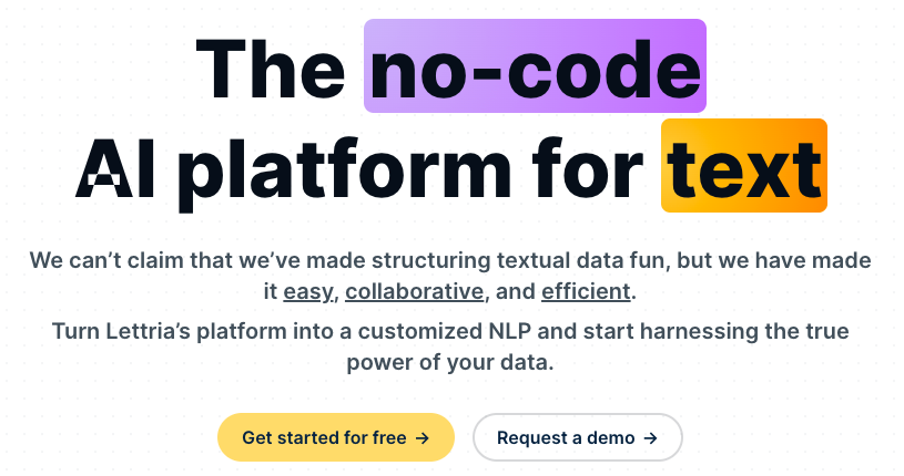 Lettria is a no-code AI platform for text that allows users to create their own NLP projects without writing a single line of code. The platform offers a range of features, including text labeling, text cleaning, ontology management, data quality, NLP training, and knowledge graph. It is designed to increase productivity, automate time-consuming tasks, and get projects into production faster. It is suitable for a range of roles, from business analysts to data engineers and data scientists.