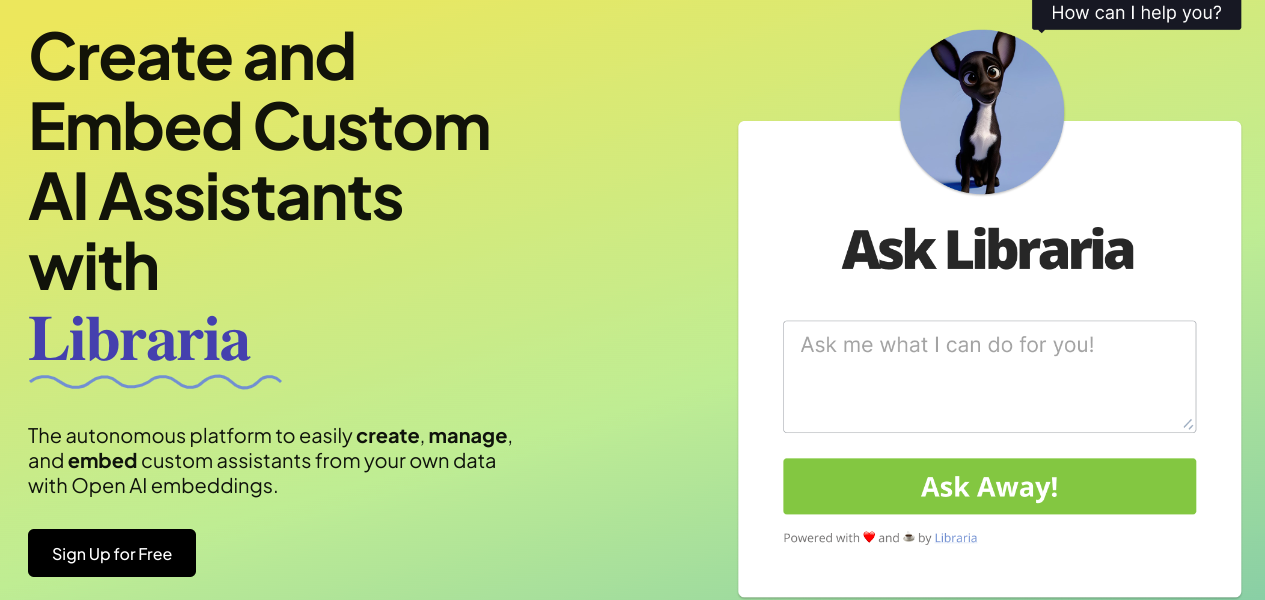 Libraria is an autonomous platform that allows users to easily create, manage, and embed custom AI assistants from their own data with Open AI embeddings. It allows users to import or sync documents into its platform, create their own AI assistant based on the documents, and query the assistant for insights. It also features URL syncing, full markdown support, customizable assistants, and a feedback dashboard to improve the assistant over time. It offers plans for individuals, teams, and enterprises.
