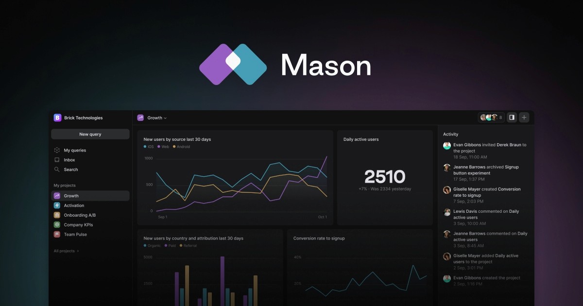 Mason is an AI-powered productivity app for data analytics that enables users to quickly query, visualize, and share data. It features an AI assistant to answer questions quickly, a search tool to access knowledge from anywhere, a fast editor that learns from each query, and the ability to collaborate directly in the code. It also integrates with popular databases.