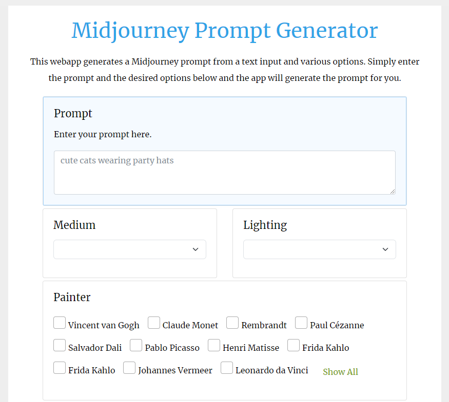 The Midjourney Prompt Generator is a web application that generates prompts based on a text input and various options. It allows users to customize their prompts with mediums, art movements, rendering engines, materials, cameras, filters, scenes, chaos, seeds, image weight, height, quality, width, aspect ratio, version, stylization, uplight, beta, HD, and same seed.