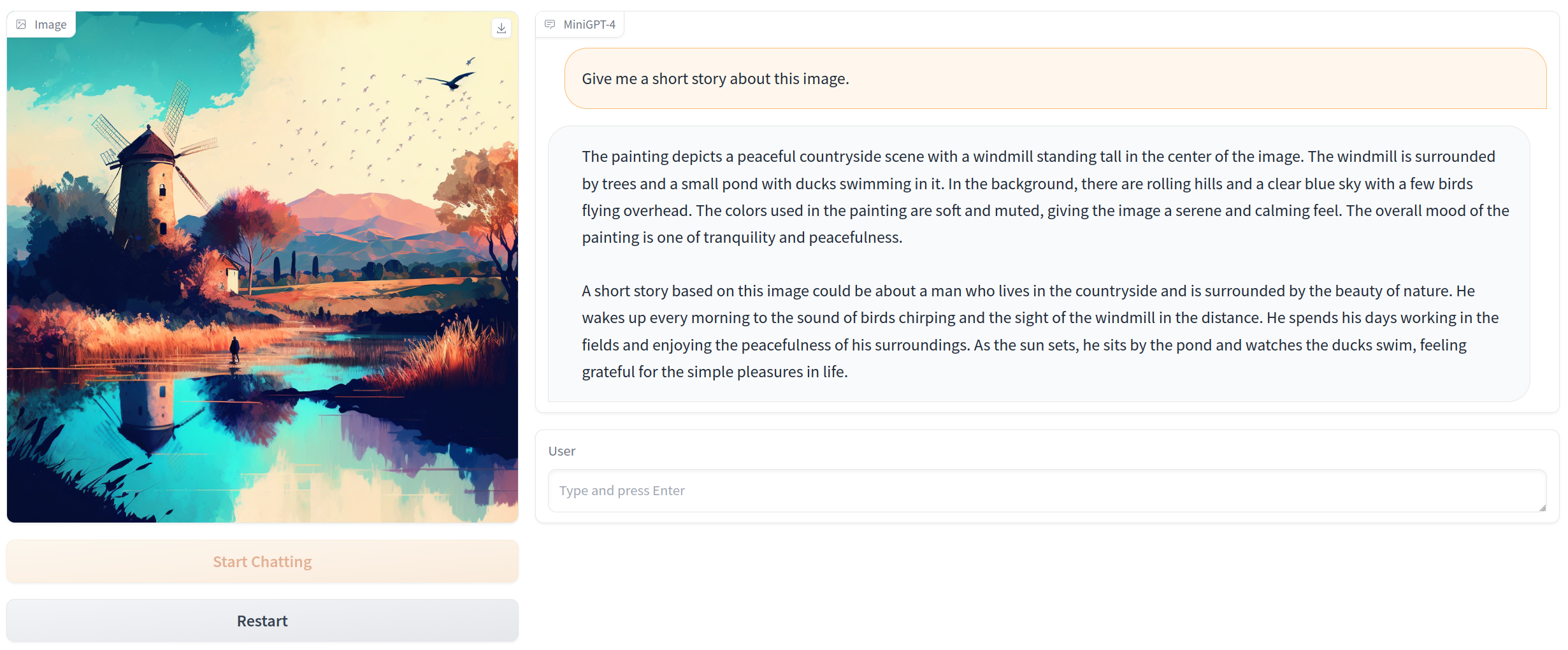 MiniGPT-4 is a tool that enhances vision-language understanding by combining a frozen visual encoder with a frozen large language model (LLM) using just one projection layer. This tool is capable of generating detailed image descriptions, creating websites from hand-written drafts, writing stories and poems inspired by given images, providing solutions to problems shown in images, and teaching users how to cook based on food photos. MiniGPT-4 is highly computationally efficient, as it only requires training the linear layer to align the visual features with the Vicuna using approximately 5 million aligned image-text pairs.