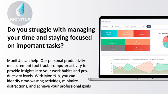 MonitUp is a personal productivity measurement tool that helps users manage their time and stay focused on important tasks. It tracks computer activity to provide insights into work habits and productivity levels, and can identify time-wasting activities and minimize distractions. It also offers AI suggestions for increased productivity, a user dashboard to show open/close times, track apps and URLs, and identify productive apps, and a screenshot feature for PC performance tracking.