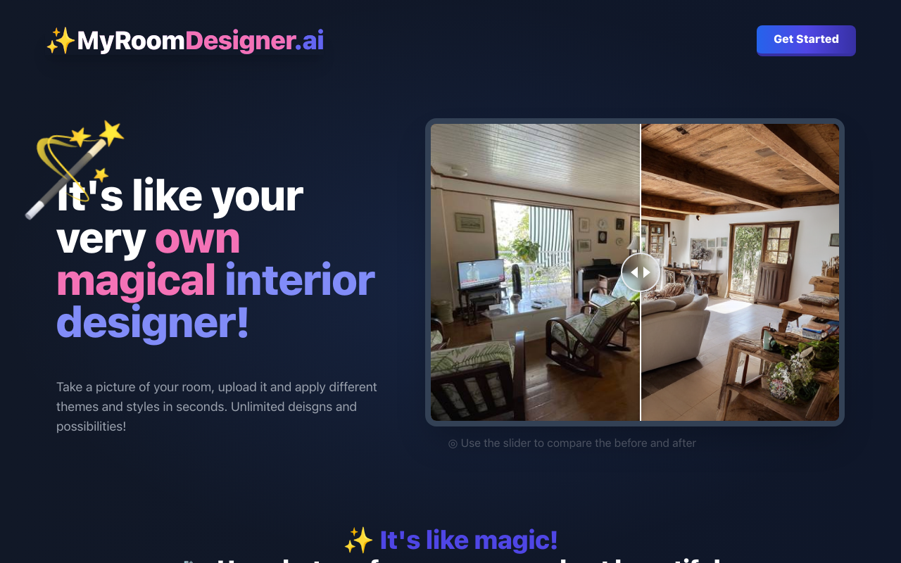 MyRoomDesigner.ai is an AI-powered interior design tool that allows users to transform any room in their home into a stylish and welcoming space in just a few clicks. It offers users a range of popular interior design themes to choose from and allows them to upload photos of their room and apply different styles and themes in seconds. Additionally, users can download and share their styled photos, backup their photos to their gallery, and purchase more renders if needed.