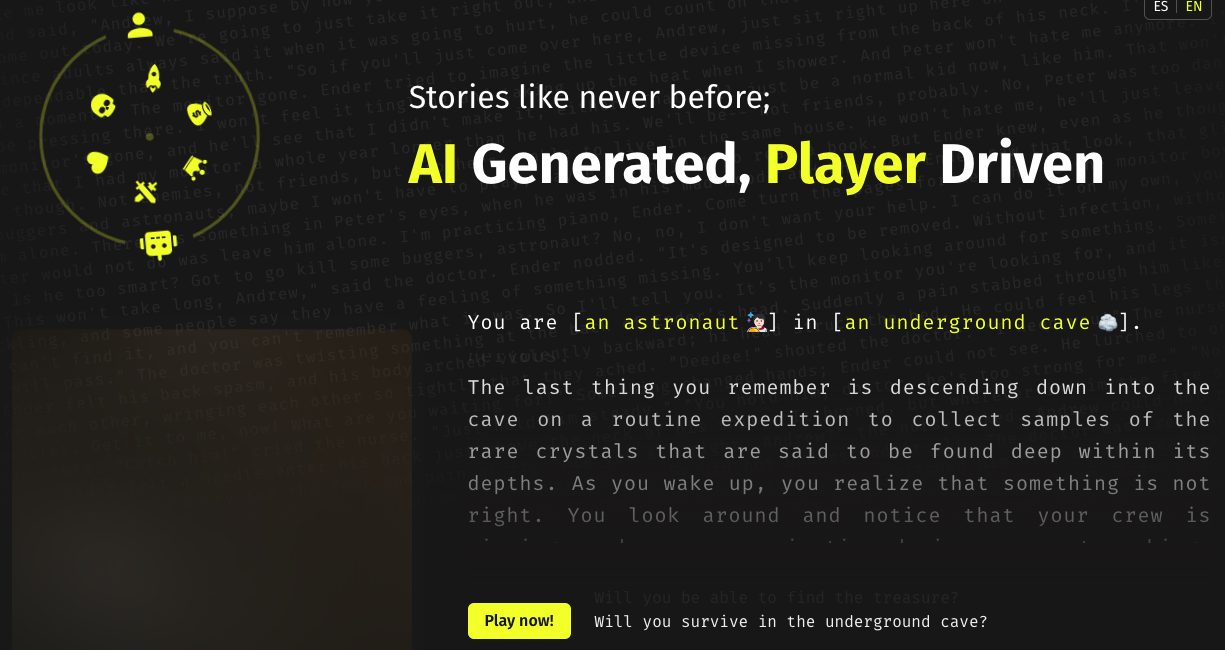 Narraive is an interactive storytelling game where players become the protagonist of their own story. The game combines the power of AI-generated text and image creation to provide a unique and immersive experience. Players decide who they are and where the story takes place, and the AI generates a story based on their choices. Players will then face hard decisions and choose which path to take.