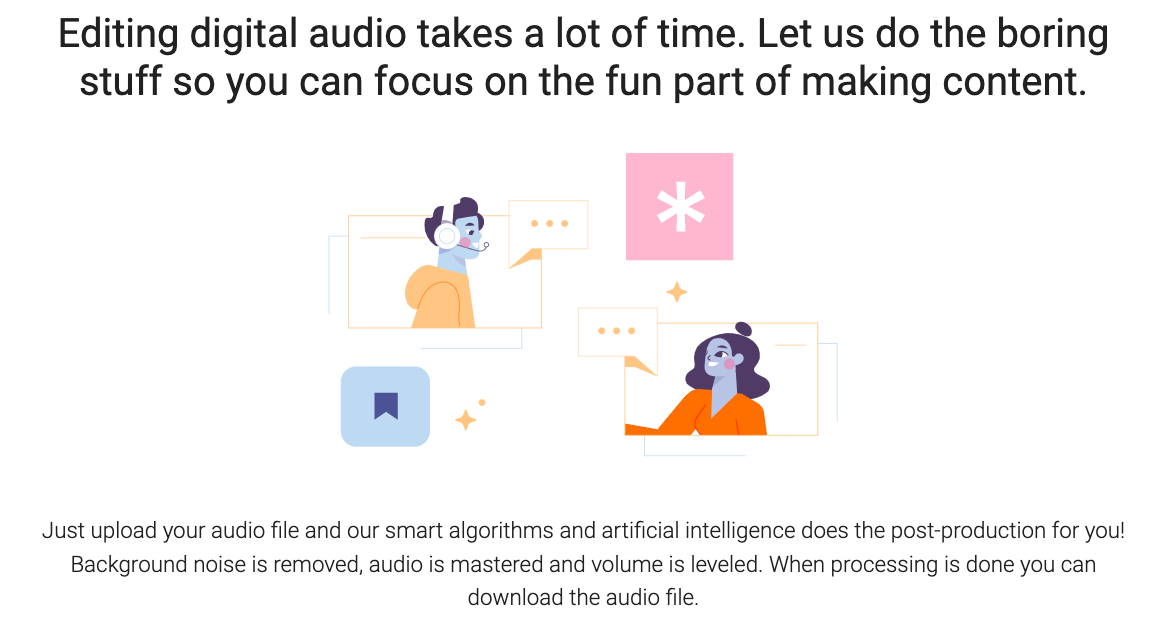 Nonoisy is an automated audio editing tool that uses artificial intelligence and smart algorithms to quickly and affordably edit digital audio files. It removes background noise, masters the audio, and levels the volume, allowing users to focus on the fun parts of creating content.
