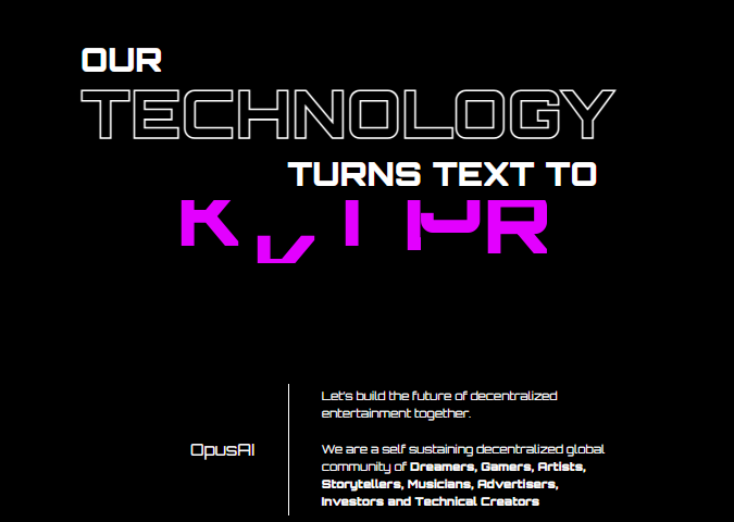 The Opus tool is a self-sustaining decentralized global community that enables creative professionals, gamers, storytellers, and performers to create, collaborate, and monetize their work. It uses text-to-video generation with AI and computational production to generate original content at a fraction of the cost and with unmatched speed. It also features lighting, camera control, terrain, trees, grass, flora, houses, buildings, roads, humanoid characters, and animations.