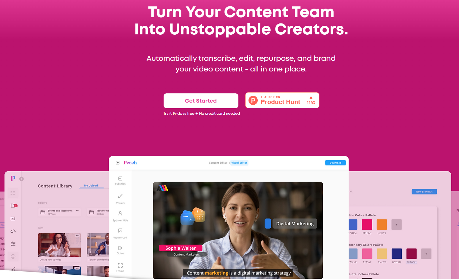 Peech is a generative AI video platform designed for marketing teams, allowing them to quickly and easily create high-quality and engaging videos. It features an automatic editing process, a smart library for content management, auto-generated subtitles, customizable brand elements, repurposing capabilities, and more. Additionally, it can turn one video into a goldmine of content, allowing teams to save resources and scale their success.