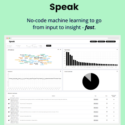 Speak is a no-code recording, transcription and analysis engine that helps users uncover actionable insights in audio, video and text data. It features automated transcription, natural language processing, sentiment analysis, data visualization, embeddable audio and video recorders, integrations, Speak Magic Prompts and more. It is trusted by 50,000+ companies, researchers and marketers to reduce manual labor, unlock competitive advantages, build stronger customer relationships and make better decisions.