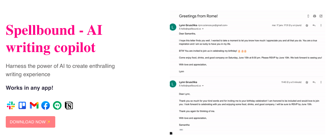 SpellBound is an AI writing copilot that can be used to create enthralling writing experiences. It includes features such as Tone Wizzard, which can help you adjust the tone of your writing, Grammar Genius, which can help you correct grammar and spelling mistakes, and Quickfire Replies, which can provide you with instant replies. It is available for MacOs and can be tried for free for 7 days.