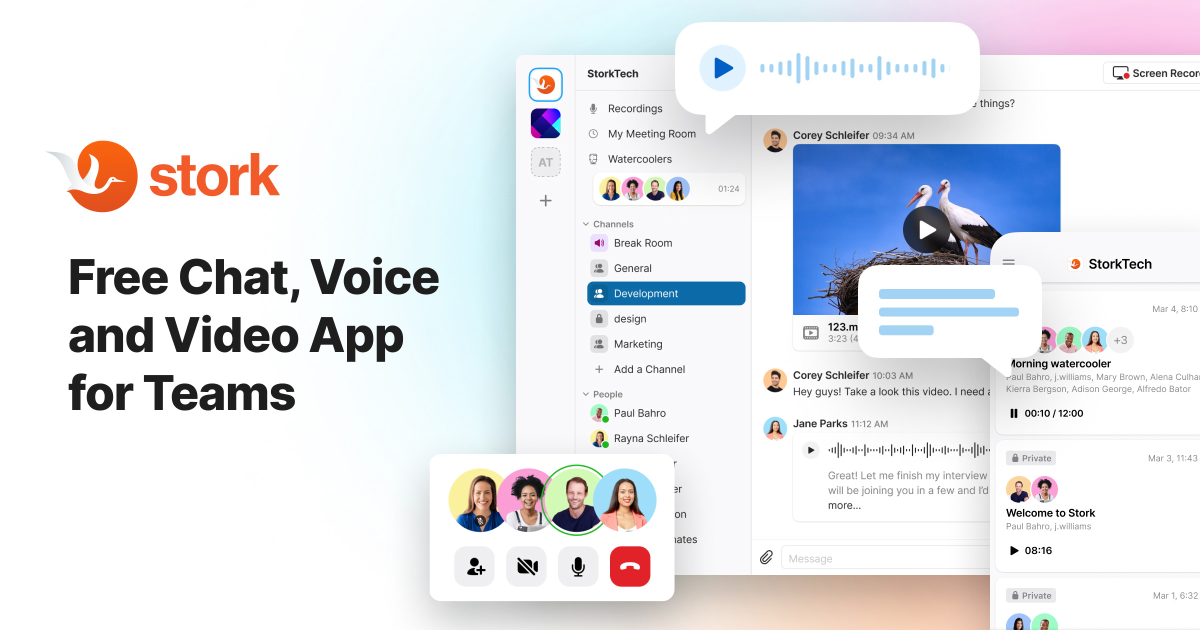Stork is a collaboration workspace for hybrid and remote teams that allows them to work asynchronously aided by Artificial Professionals. It provides features such as recording calls, voice and video notes, channels for team alignment, watercoolers for serendipitous meetings and a built-in screen recorder to share video stories. It also provides read and playback receipts for all messages, video, and audio conferences.