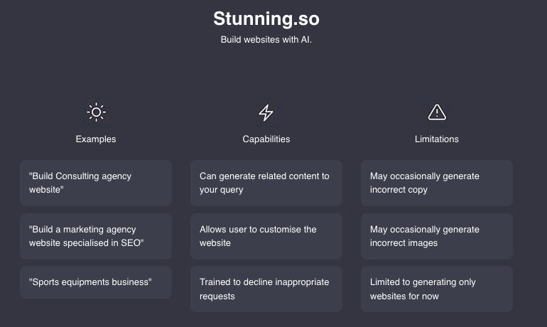 Stunning.so is a tool that uses AI to help users build websites quickly and easily. It can generate related content to user queries and can be customized to user preferences. However, there are some limitations as it may occasionally generate incorrect copy or images and is currently limited to generating only websites. Stunning.so is offering a free beta preview and is currently accepting feedback to help improve the tool.