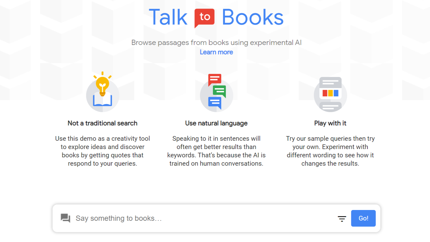 An AI-powered search engine that allows users to ask questions about books and get natural language responses. The website uses advanced machine learning algorithms to generate responses from millions of books, giving users a conversation-like experience. It provides an engaging way to explore and discover new books, as well as offering a unique way to delve deeper into topics and explore a wide range of topics.