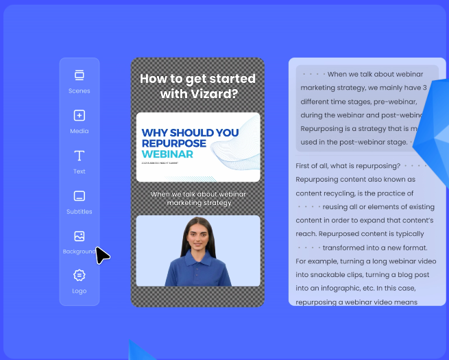 Vizard is a tool that enables users to easily repurpose existing video content with minimal effort. It offers features such as automated video editing, text-to-speech, and video-to-image conversion, allowing users to quickly create professional-looking videos for their projects.