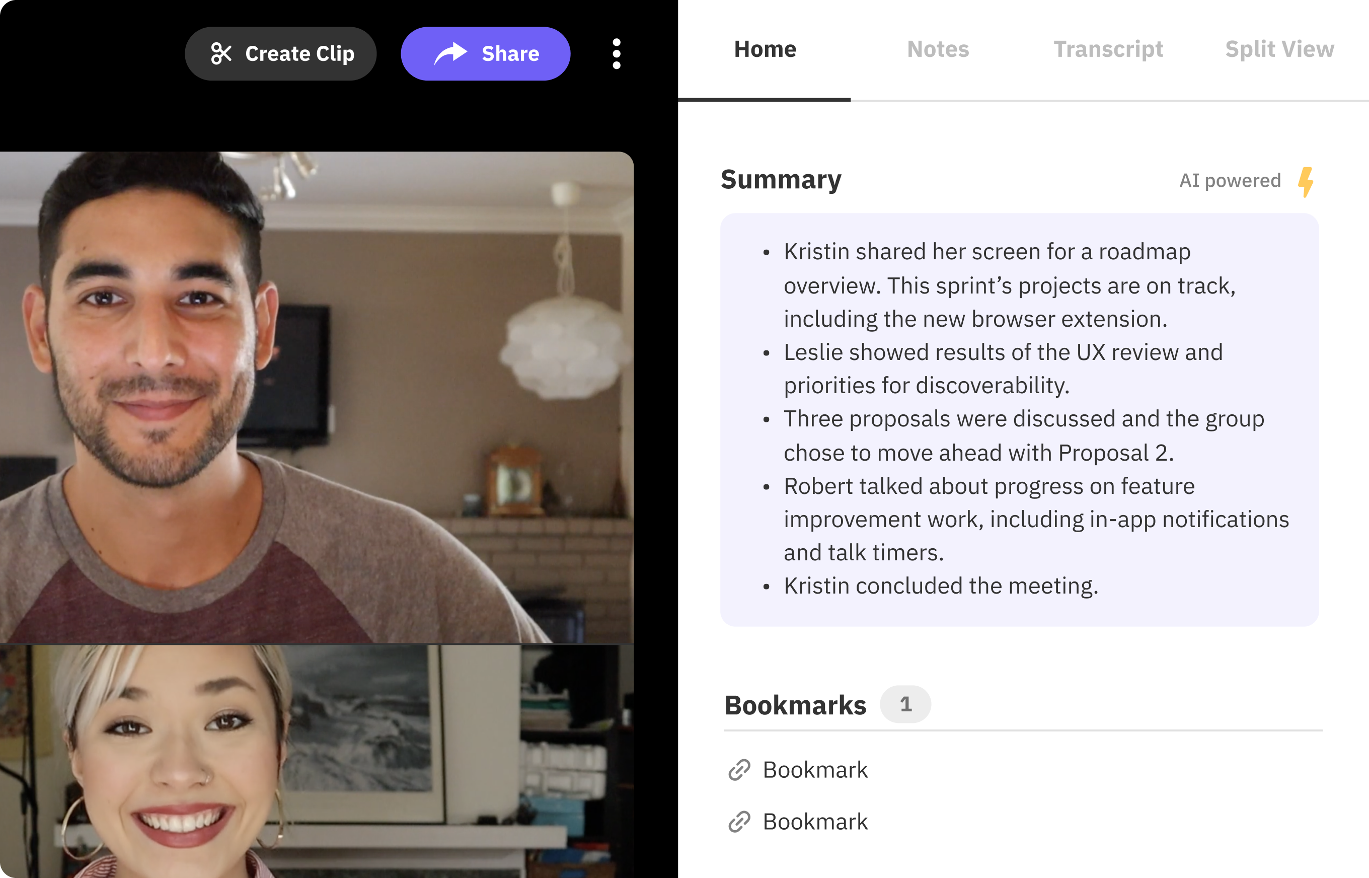Vowel AI's automated meeting summaries allow users to save time on admin work and keep everyone on the same page. Record meetings in Vowel and the AI-powered summary will be the first thing you see in the Home tab. Review, edit, and copy/paste to share with others, or click on a past recorded meeting from the dashboard to instantly review the summary alongside the transcript, recording, and notes.